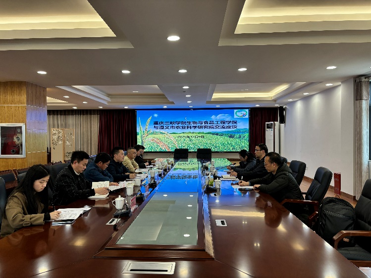 12月9日,重庆三峡学院生物与食品工程学院汪开拓教授、胡景涛副研究员和芮璐博士一行赴遵义市农业科学院开展科技交流。遵义市农科院院长王奥、党委书记张道初,副院长苟晓松、田浩等出席座谈会。