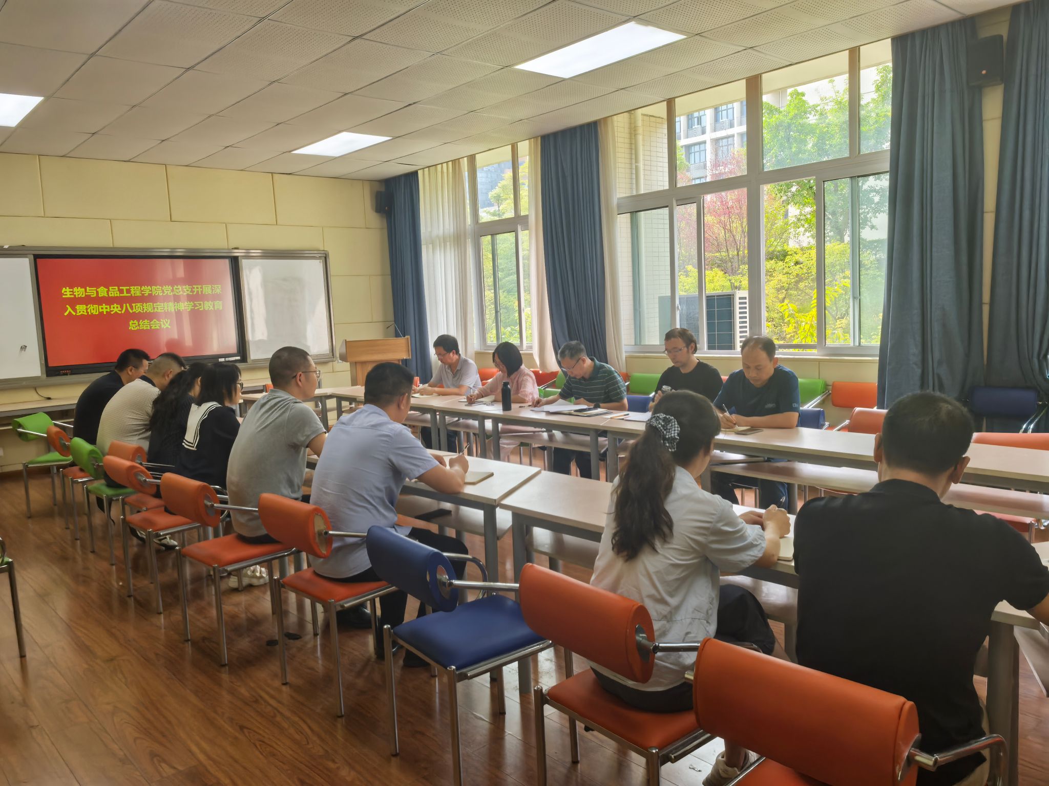 9月18日上午,生物与食品工程学院党总支在慎思楼2栋216会议室,召开深入贯彻中央八项规定精神学习教育总结会议。党总支书记肖国生主持会议,学院领导班子成员、党总支委员、专职组织员、各党支部书记、各系室负责人参加会议。
