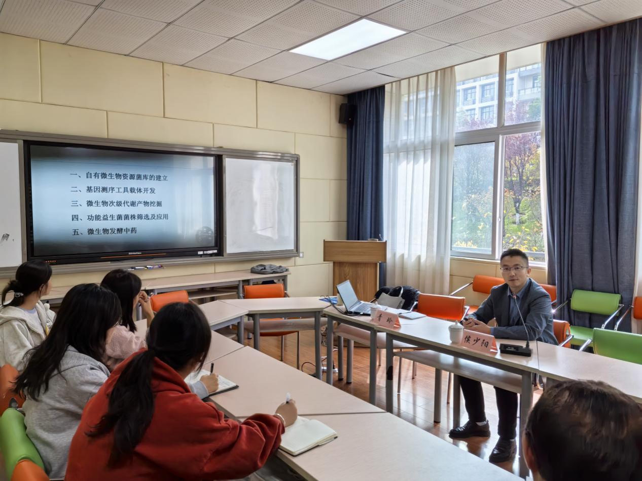 第二场讲座由菏泽学院的侯少阳副教授主讲,主题为《微生物资源开发与益生菌发酵中药》。报告介绍团队自建的微生物资源库、基因编辑工具载体的开发,以及如何从微生物中挖掘具有潜力的次级代谢产物,重点呈现了功能益生菌菌株的筛选策略及其应用,并展望微生物发酵中药产业化前景。
