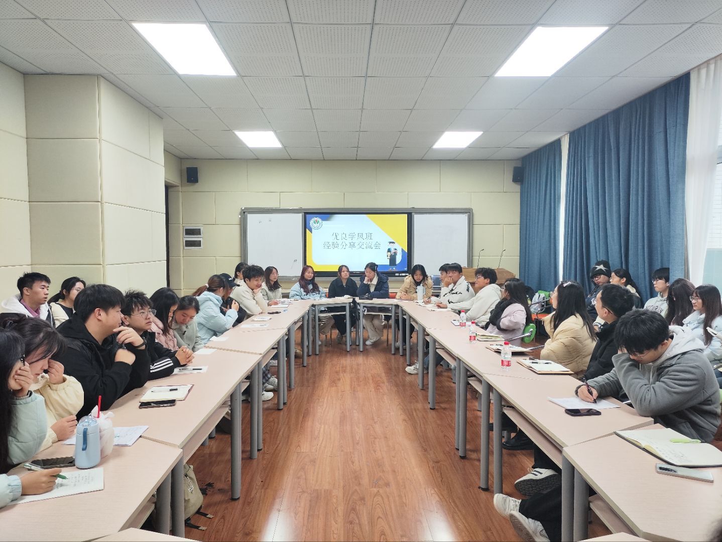 交流会上,两个优秀班级代表围绕班级制度建设展开分享,介绍了具有可操作性、易于推广的具体做法,为在场班级提供了切实可行的参考。在互动问答环节,2024级、2025级班委踊跃提问,就“如何调动同学积极性”等实际问题向学长学姐及在场老师请教。高年级学生结合自身经历给予具体建议,老师们则从管理育人的专业角度进行了深入分析与详细指导。