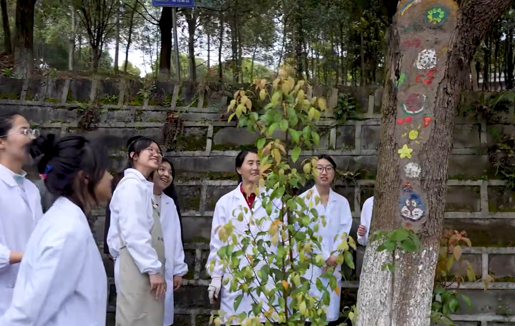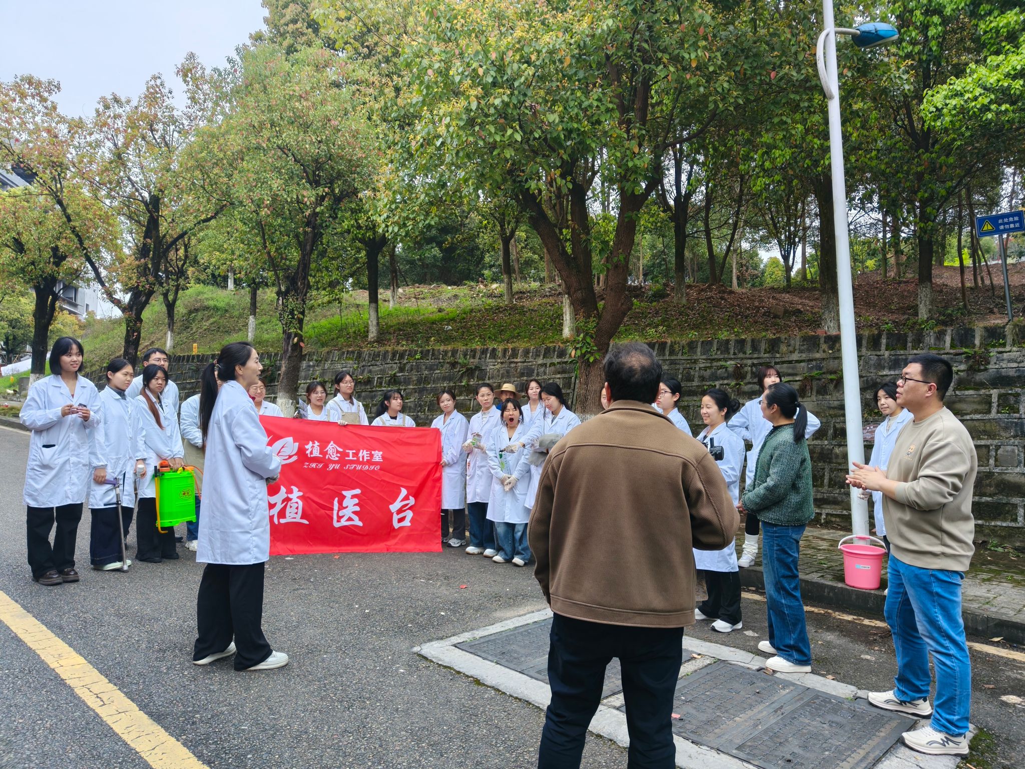 活动从接到后勤求助开始,我院学子分组对病害树木进行诊断,制定综合治理方案。在甘丽萍老师带领下,大家运用施肥枪精准改良土壤、配制环保泥浆处理树干伤口,并创新性地对树洞进行艺术性彩绘修复,实现救治与美化的有机统一。