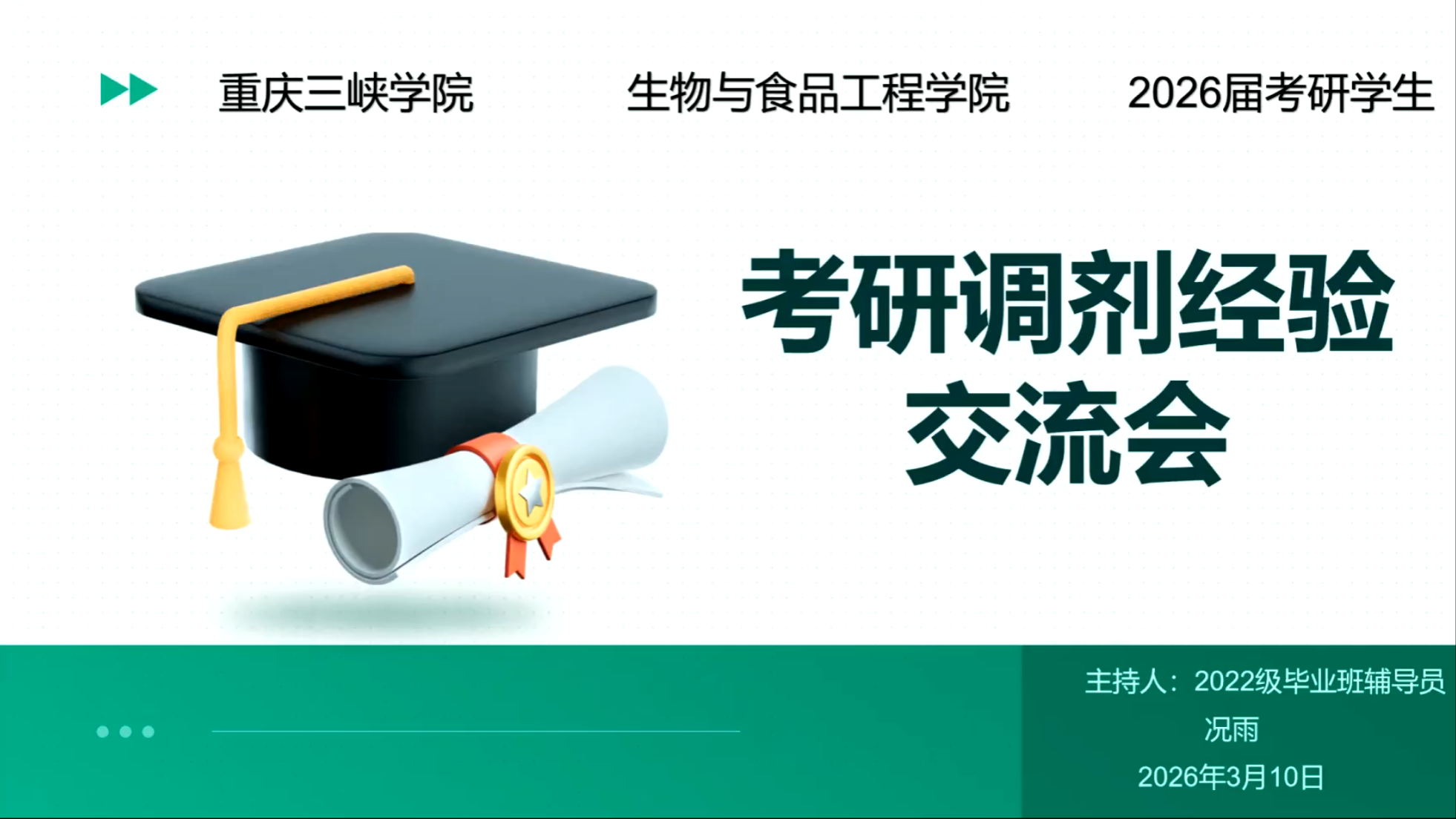 为帮助2026届毕业生更好地应对考研调剂,3月10日晚,生物与食品工程学院通过线上平台举办了考研调剂经验交流会。活动由学院毕业生辅导员况雨主持,邀请三位2025届优秀毕业生肖艳、刘亚岚、任娟分享调剂经历与备考心得,吸引了众多正在准备调剂的同学参与。